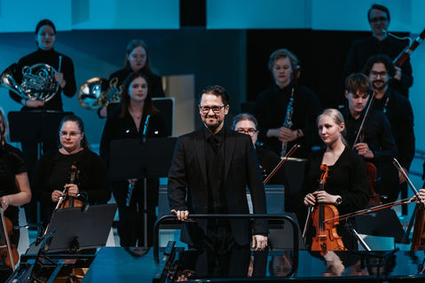 Ohjelmassa Jukka Perkon Avoimen taivaan alla -teos (2024) saksofoneille, elektroniikalle ja lyömäsoittimille ja tanssille,